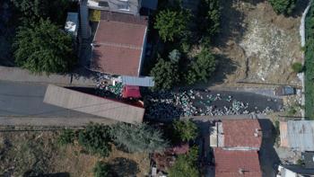Tırın çarptığı evde büyük hasar meydana gelirken tır dorsesinde bulunan turşu dolu bidonlar da etrafa dağıldı. Olay yeri ve çevreye saçılan turşular havadan görüntülendi.